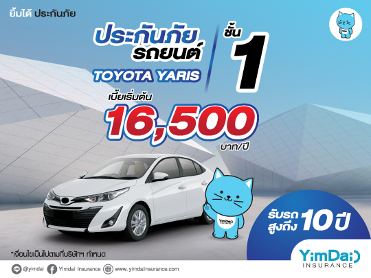 สนใจทำประกันภัย คลิกเลย! >> ประกันภัยชั้น 1 TOYOTA YARIS *เงื่อนไขเป็นไปตามที่บริษัทฯ กำหนด |