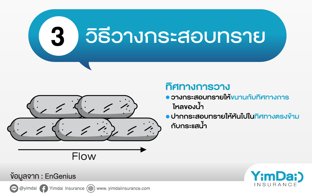 - วางกระสอบทรายให้ขนานกับทิศทางการไหลของน้ำ