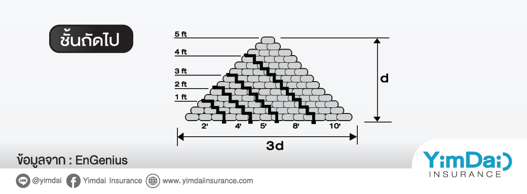 จัดเรียงชั้นกระสอบทรายให้เป็นสามเหลี่ยมพีระมิดเพื่อจะได้รับแรงดันของน้ำให้ได้มากที่สุด โดยที่ส่วนของฐานจะต้องกว้างกว่าความสูงถึง 3 เท่า
