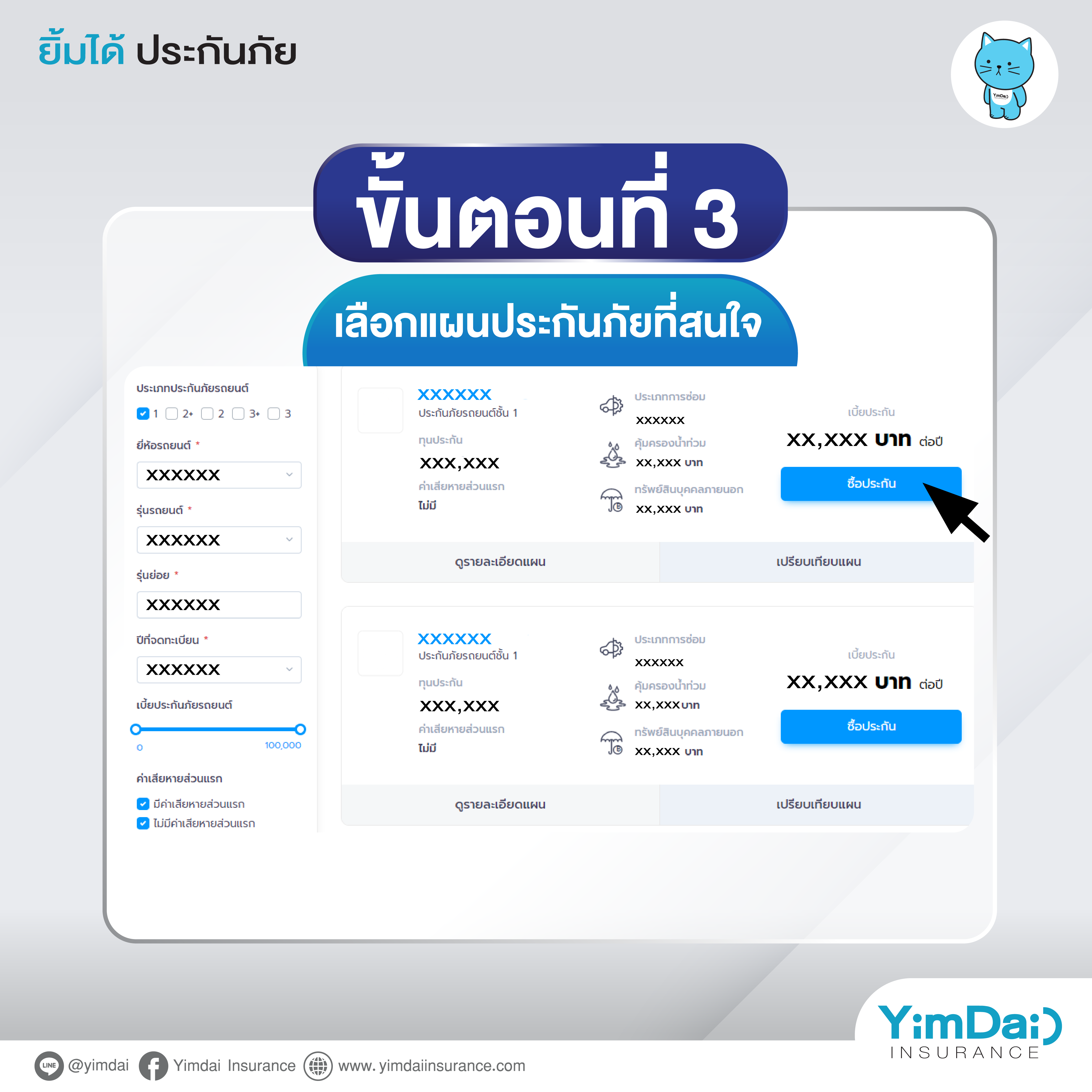 ขั้นตอนที่ 3: เลือกแผนประกันภัยที่สนใจ สามารถเลือกแผนประกันที่เหมาะสมกับความต้องการของคุณ เช่น ประกันภัยรถยนต์ประเภท 1 (คุ้มครองสูงสุด) ประเภท 2 (คุ้มครองภัยจากอุบัติเหตุหรือการโจรกรรม) หรือประเภท 3 (คุ้มครองสำหรับการชนที่เกิดจากผู้ขับขี่)