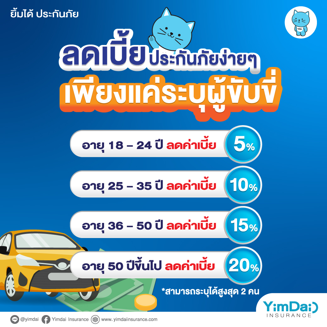 *ในกรณีทำประกันภัยระบุอายุผู้ขับขี่ 2 คน ส่วนลดผู้ขับขี่จะคิดจากอายุของผู้ขับขี่ที่อายุน้อยที่สุด เช่น หากทำประกันภัยแบบระบุชื่อผู้ขับขี่ 2 คน คุณแม่อายุ 55 ปี อีกท่านอายุ 26 ปี ส่วนลดค่าเบี้ยจะเท่ากับ 10% เท่านั้น ไม่ใช่ 20%