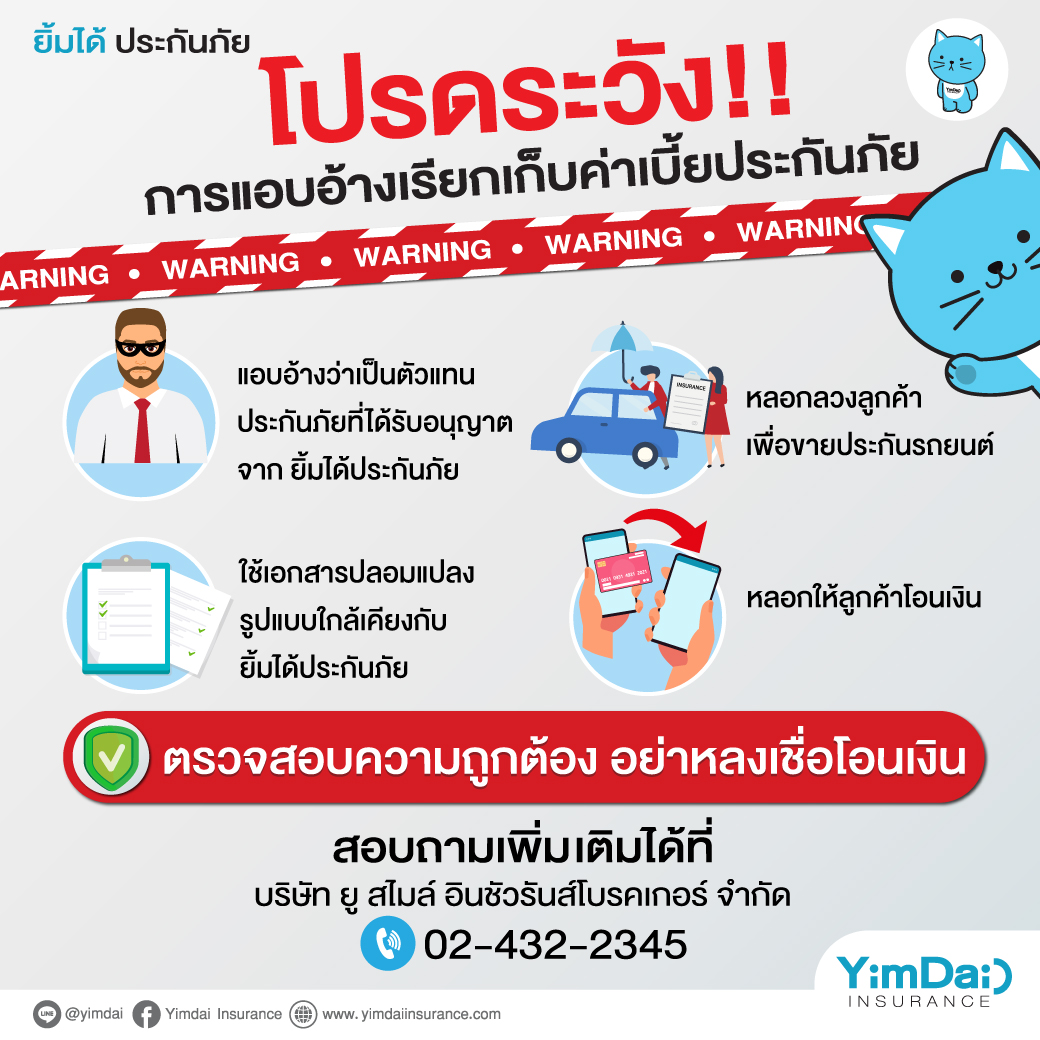 ผู้ขับขี่สามารถตรวจสอบความถูกต้องของตัวแทนประกันภัยก่อนทุกครั้งหรือ โทรสอบถามเพิ่มเติมได้ที่ บริษัท ยู สไมล์ อินชัวรันส์โบรคเกอร์ จำกัด เบอร์โทร : 02-432-2345 หรือ Line : @yimdai
