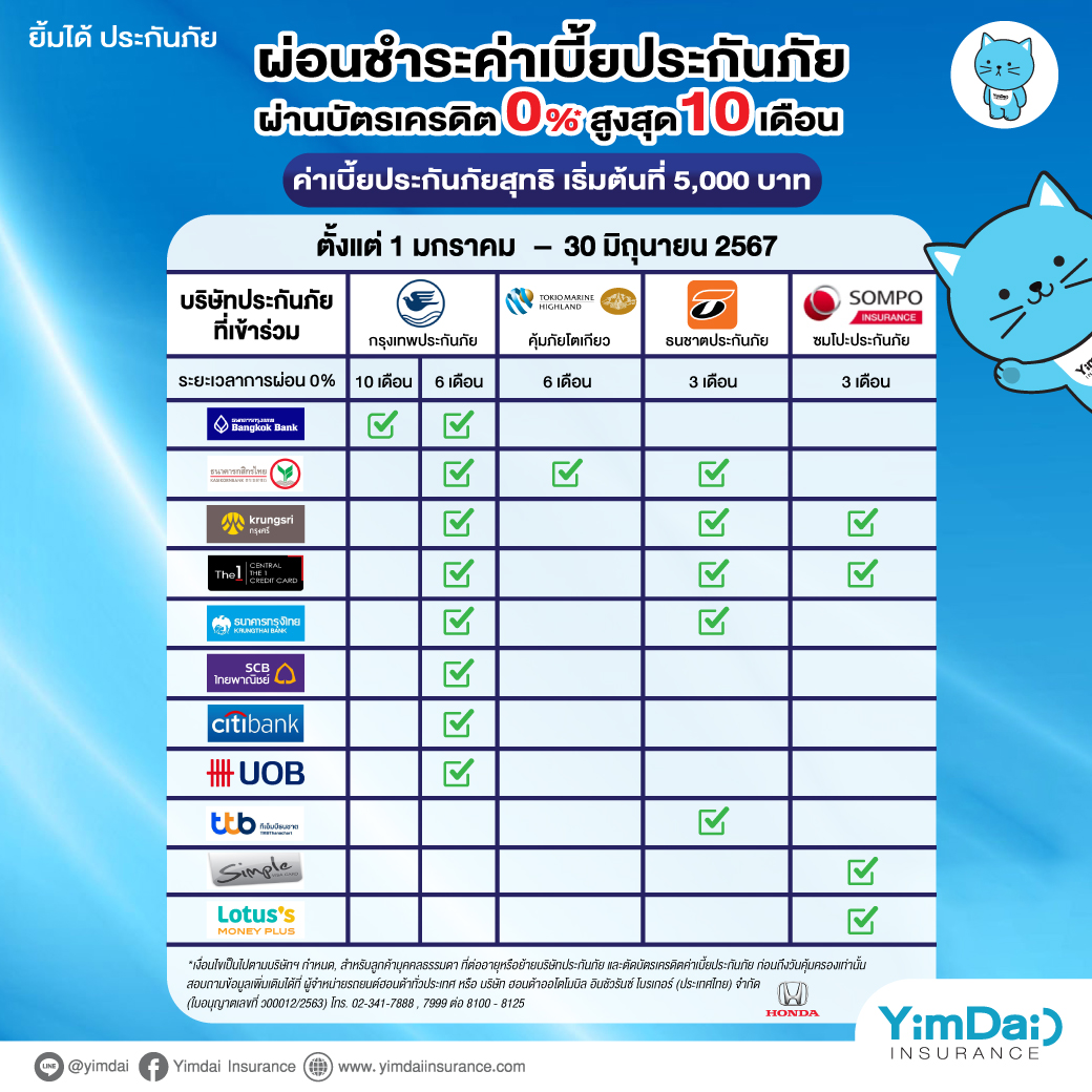 ผ่อนชำระค่าเบี้ยประกันภัยผ่านบัตรเครดิต 0%* สูงสุด 10 เดือน ค่าเบี้ยประกันภัยสุทธิ เริ่มต้นที่ 5,000 บาท ตั้งแต่ 1 มกราคม - 30 มิถุนายน 2567 บริษัทประกันภัยที่เข้าร่วม