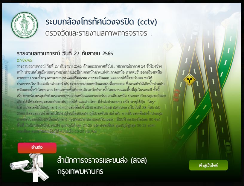 สามารถตรวจสภาพจราจรได้ผ่านเว็ปไซค์ www.bmatraffic.com คลิก จะแสดงหน้าแรกเกี่ยวกับสภาพอากาศ และข่าวสำคัญด้านจราจรของกรุงเทพมหานคร หากต้องการเข้าสู่หน้าแผนที่ให้คลิก เข้าสู่เว็ปไซค์