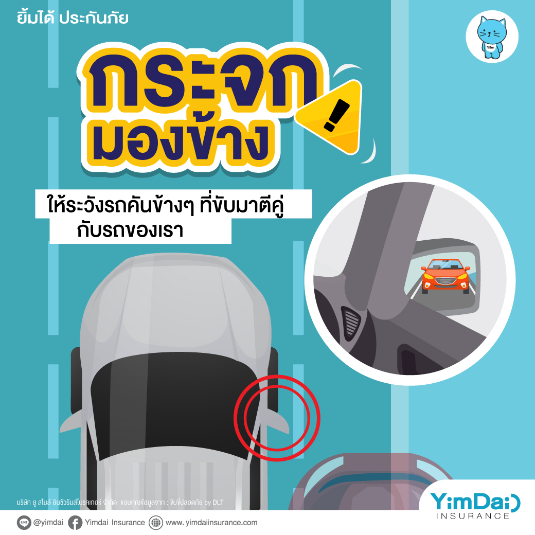 - ให้ระมัดระวังในจังหวะที่รถคันข้างๆ ที่ขับขี่ขึ้นมาตีคู่กับรถของเรา มักจะเป็นจุดบอดที่อยู่นอกเหนือจากองศาการมองเห็นของกระจกที่เราปรับไว้