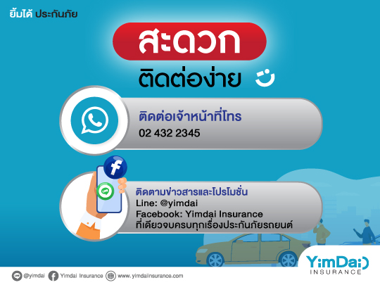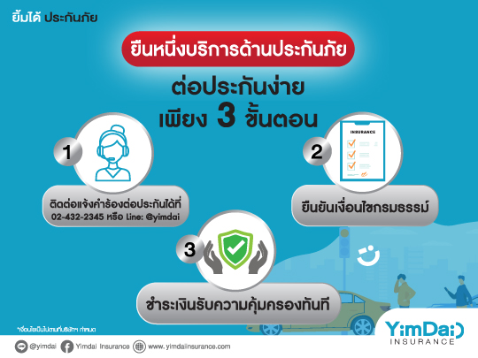 - ติดต่อแจ้งคำร้องต่อประกันได้ที่ 02-432-2345 หรือ Line: @yimdai
