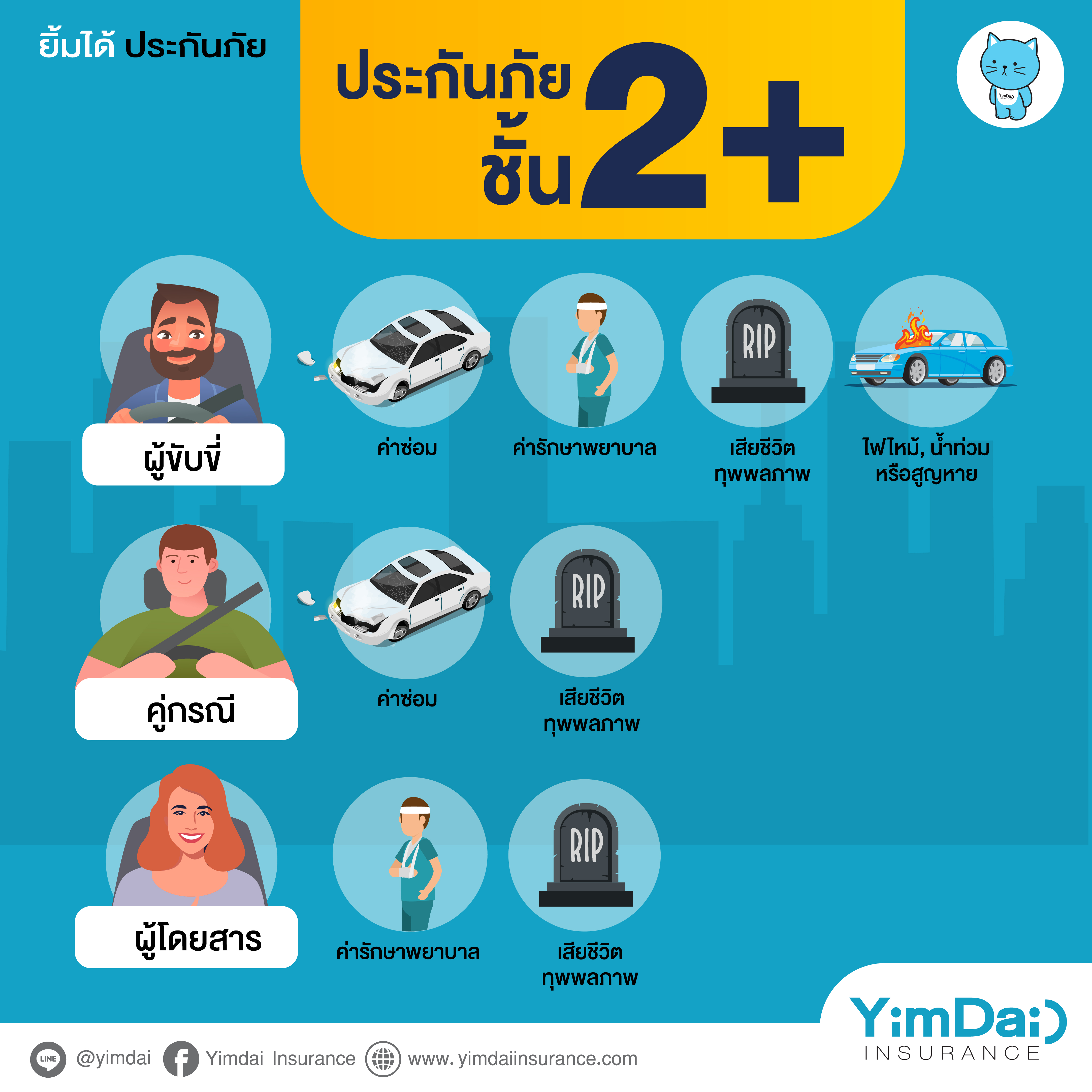 จะได้ราคาที่ประหยัดกว่าประกันภัยชั้น 1 แต่ในความคุ้มครองนั้นจะต่างกันเล็กน้อยประกันภัยชั้น 2+ นั้นจะคุ้มครองความเสียหายต่อตัวรถคันที่เอาประกันจากการชนกับยานพาหนะทางบกที่สามารถระบุตัวตนได้ แต่จะไม่คุ้มครองความเสียหายของรถยนต์เมื่อเกิดอุบัติเหตุแบบไม่มีคู่กรณีและความเสียหายของกระจกรถ