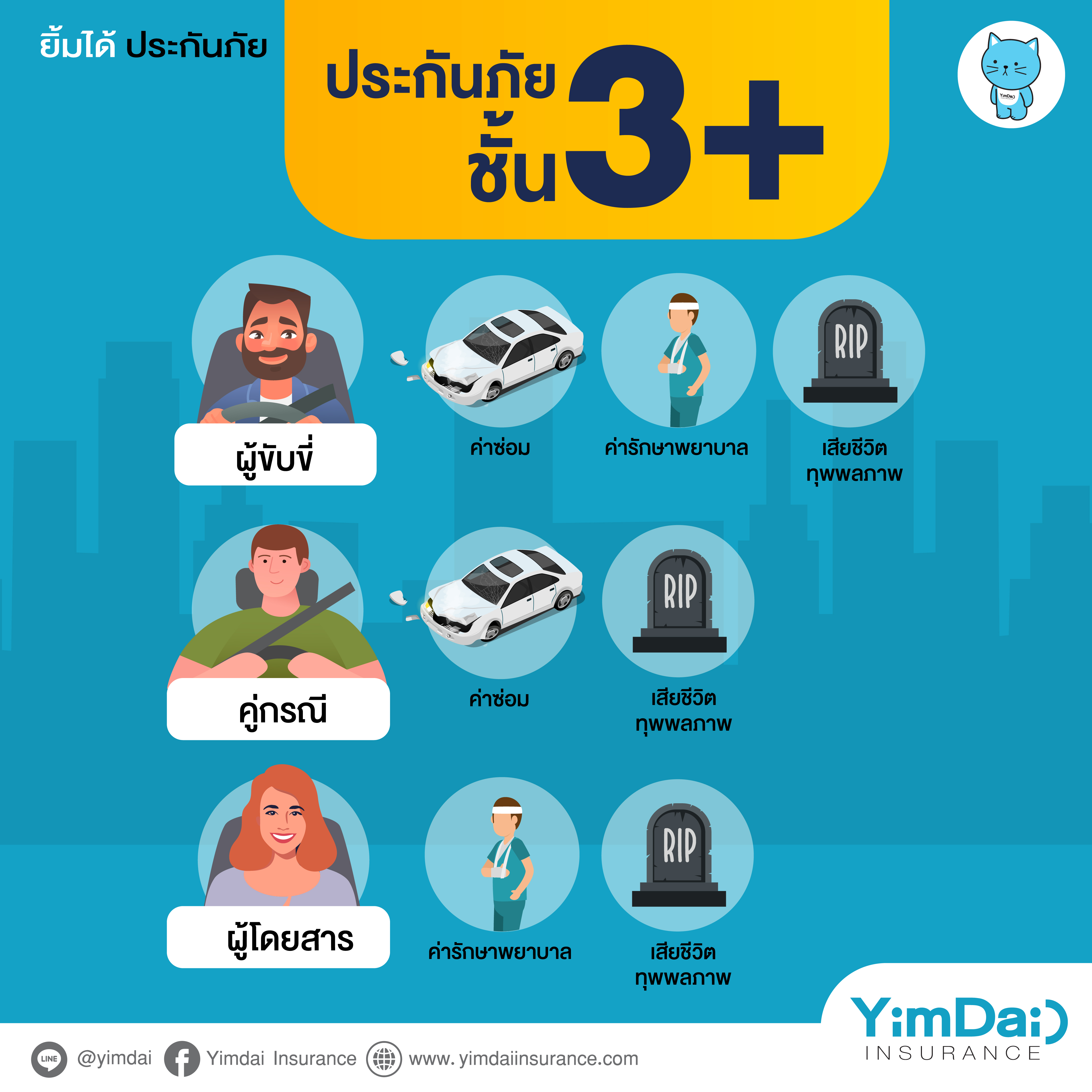 ประกันภัยรถยนต์ ชั้น 3 คุ้มครองความเสียหายเฉพาะทรัพย์สินและการบาดเจ็บหรือเสียชีวิตของบุคคลภายนอก เมื่อผู้ขับรถคันเอาประกันเป็นฝ่ายต้องรับผิด และยังคุ้มครองค่ารักษาพยาบาล การประกันอุบัติเหตุส่วนบุคคล และการประกันตัวของผู้ขับขี่