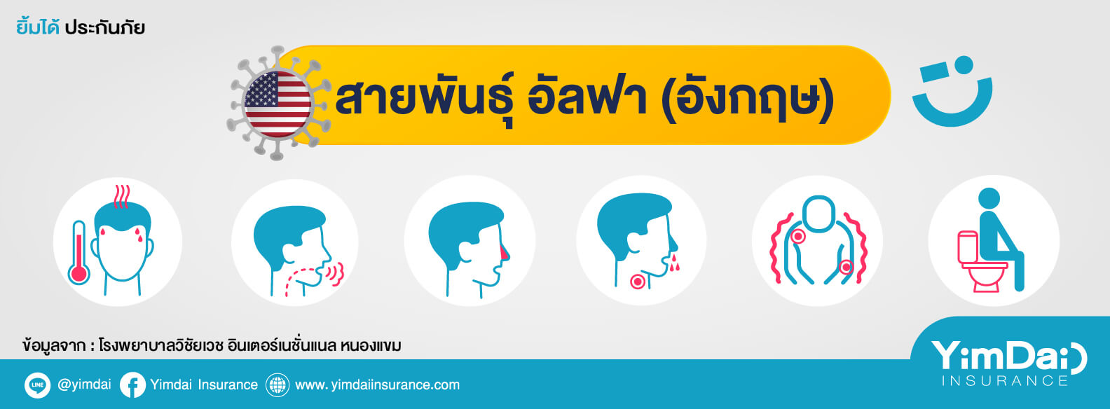 พบว่าสายพันธุ์อัลฟ่า (อังกฤษ) เป็นสายพันธุ์ที่มีการแพร่กระจายเชื้อได้ง่ายกว่าสายพันธุ์ดั้งเดิมถึง 1.7 เท่า ซึ่งอาการของโควิดสายพันธุ์อัลฟ่า (อังกฤษ) มีดังนี้