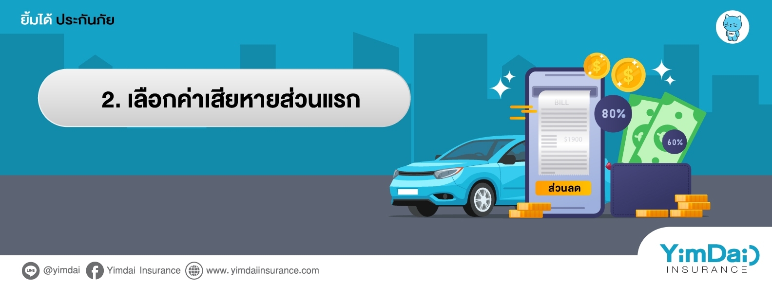 การกำหนดค่าเสียหายส่วนแรก (Deductible) คือ ค่าเสียหายส่วนแรกที่เรากำหนดจะจ่ายเองเมื่อมีการเคลมเกิดขึ้นครับ โดยทาง คปภ. จำกัดไว้ไม่เกิน 5,000 บาท เมื่อมีค่าใช้จ่ายส่วนที่เกินมาทางบริษัทประกันภัยจะต้องเข้ามาช่วยรับผิดชอบ ยกตัวอย่างเช่น หากเราทำประกันภัยรถยนต์ชั้น 1 เอาไว้และเบี้ยประกันภัย 20,000 บาท และเราระบุจะจ่ายค่าเสียหายส่วนแรก 5,000 บาทเต็มอัตรา ค่าเบี้ยประกันภัยจะลดลงเหลือประมาณ 14,000 - 16,000 บาทนั้นเองครับ
