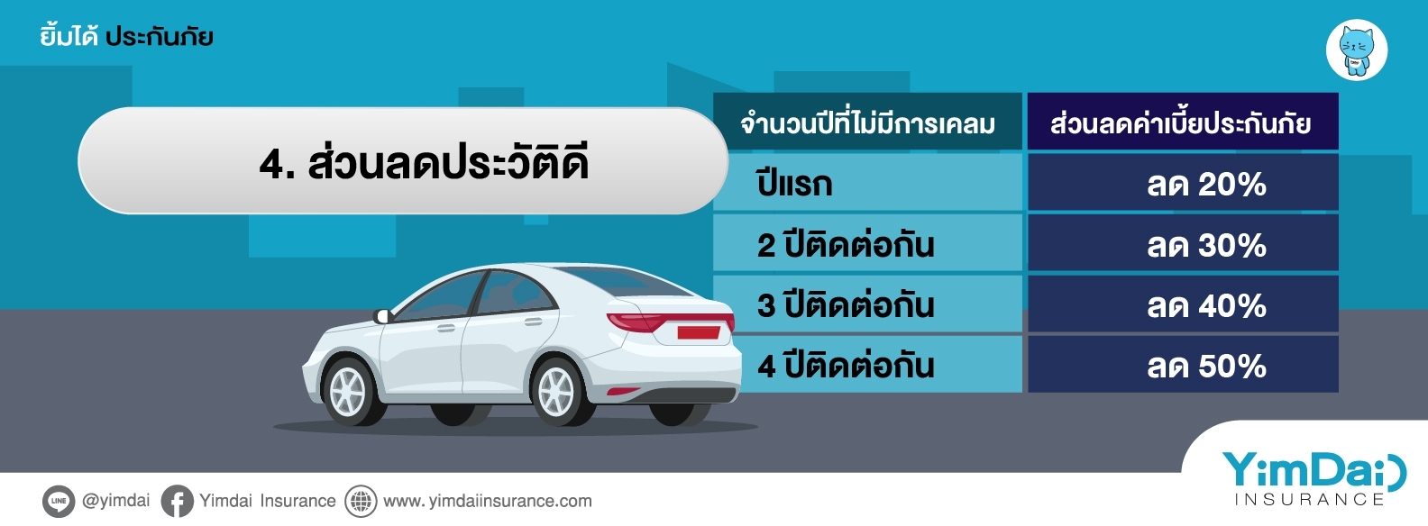- ประวัติดี 4 ปีติดต่อกัน รับส่วนลด 50% สำหรับค่าเบี้ยประกันในปีถัดไป (จนกว่าจะมีการเคลมและเป็นฝ่ายผิด)