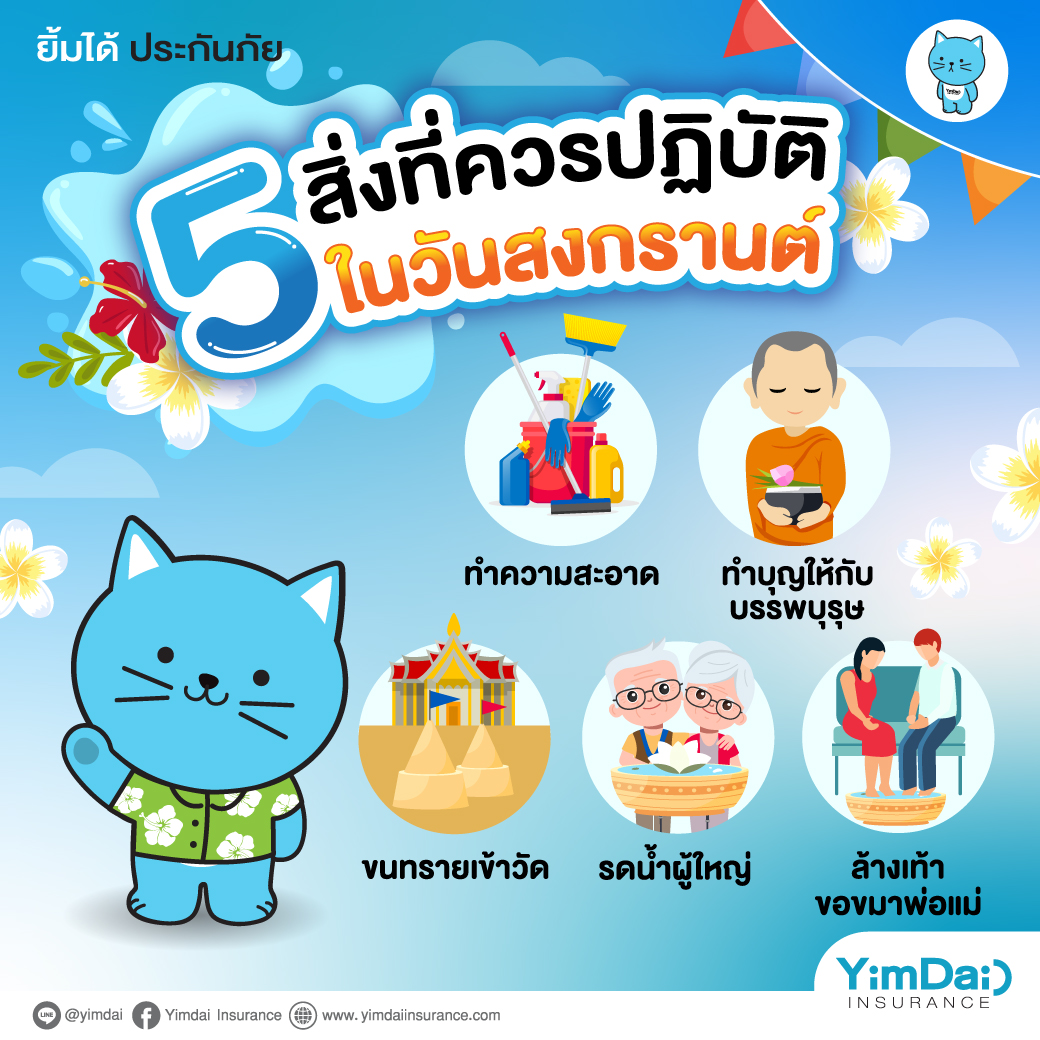 ในเทศกาลปีใหม่ของไทย หรือ วันสงกรานต์หลายๆ ท่านเดินทางกลับภูมิลำเนาเพื่อกลับบ้านเดินทางหาครอบครัว วันนี้ ยิ้มได้ประกันภัย ได้นำความรู้เล็กๆ น้อยๆ เกี่ยวกับ 5 สิ่งที่ควรปฏิบัติในวันสงกรานต์ ที่จะช่วยนำพาชีวิตรุ่งเรือง รุ่งโรจน์ และเป็นสิริมงคลแก่ชีวิต มาฝากทุกท่านกันครับ มีอะไรบ้างไปดูกันเลย